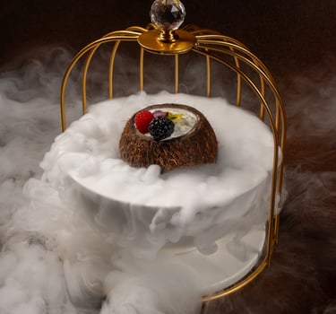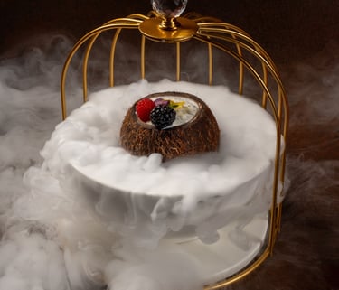 A beautifully caramelized Basque-style cheesecake with a creamy, velvety center, served with rich chocolate sauce and elegantly garnished with fresh berries and edible flowers. A luxurious dessert that delivers deep flavor and a perfectly smooth finish