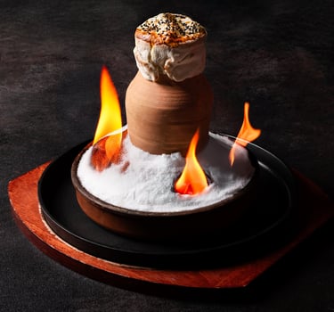 A special mix of the chicken and vegetables, cooked in a clay pot, covered with dough and presented in a special way