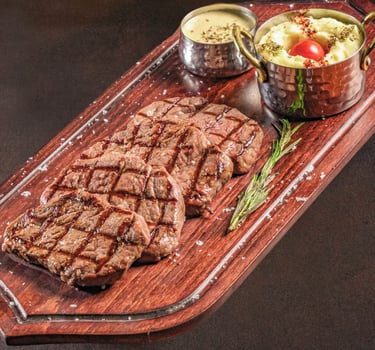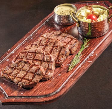 300g Angus striploin steak, delicately dry-aged to enhance its depth of flavor and velvety texture. Expertly grilled to preserve its juiciness and perfect balance, served with silky mashed potatoes and a luxurious signature sauce, complemented by a special show presentation that elevates the entire dining experience.