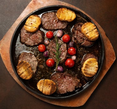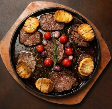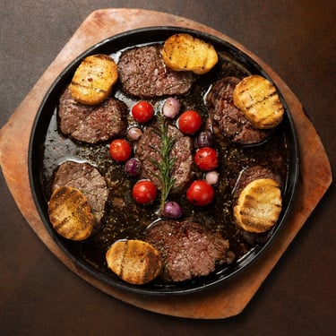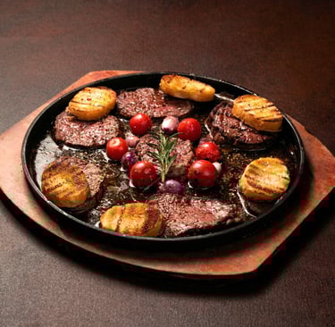 400g Angus beef bites, expertly cut for exceptional tenderness and deep, rich flavor. Grilled with precision to achieve a velvety, juicy texture, served with silky mashed potatoes and a luxurious signature sauce, complemented by a special show presentation that elevates the entire dining experience.