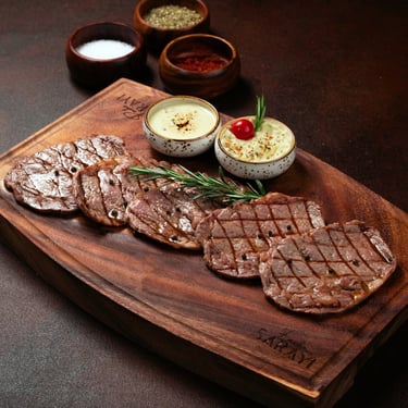 Signature Lokum Steak Delight: succulent, buttery 800g lokum steak nestled between slices of artisanal bread, paired with a side of herb-infused compound butter to elevate every bite.