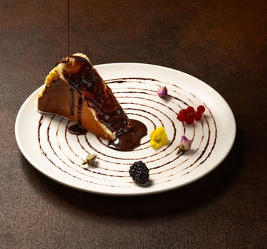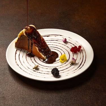 A beautifully caramelized Basque-style cheesecake with a creamy, velvety center, served with rich chocolate sauce and elegantly garnished with fresh berries and edible flowers. A luxurious dessert that delivers deep flavor and a perfectly smooth finish