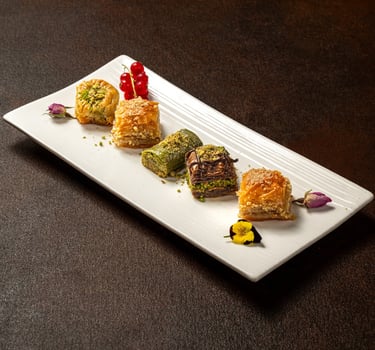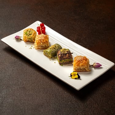 A refined assortment of premium Turkish baklava, delicately layered with nuts and finished with a light, aromatic syrup.