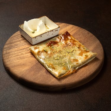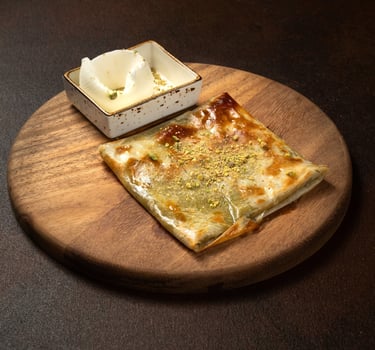 A luxurious Turkish Katmer filled with premium pistachios, baked to golden crisp perfection, and served warm with authentic Turkish ice cream… a perfect harmony of textures and flavors.